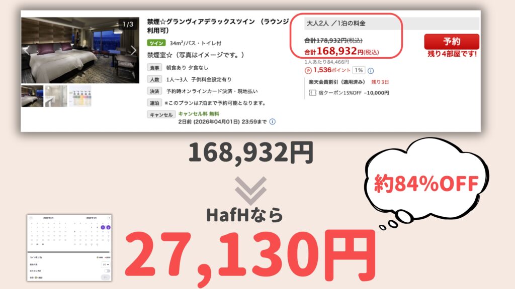 いまママ楽天では大人2人で約17万円のプランが、HafHでは同条件なのに初回キャンペーンを使えば約3万円に!
