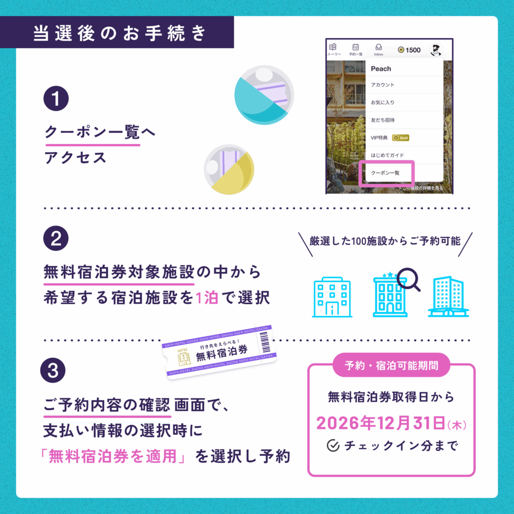 人気のホテルから予約が埋まるけど、枠が急に増えることもあるから、行きたいところが埋まっていても諦めずチェックしてみてね!
