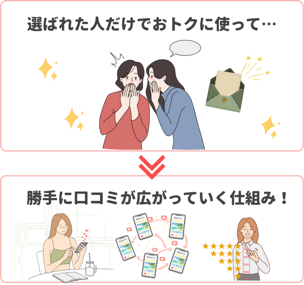 だからこそHafHは広告費をユーザーさんに還元し、口コミで広がる仕組みにしているから、こんなお得が成り立っているんだよね!