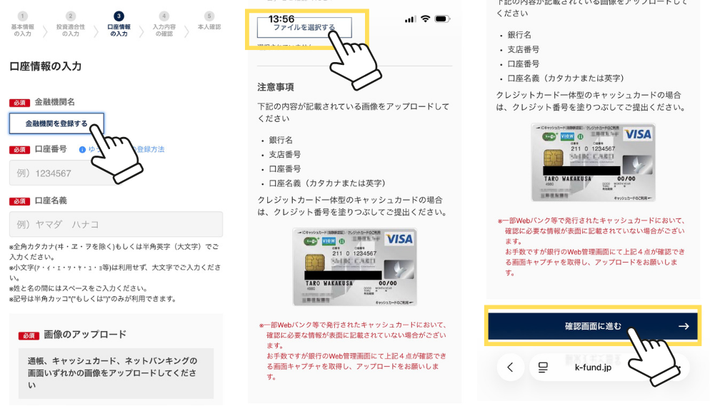 キャッシュカードや通帳の画像をアップロードする必要があるから、準備してね📷