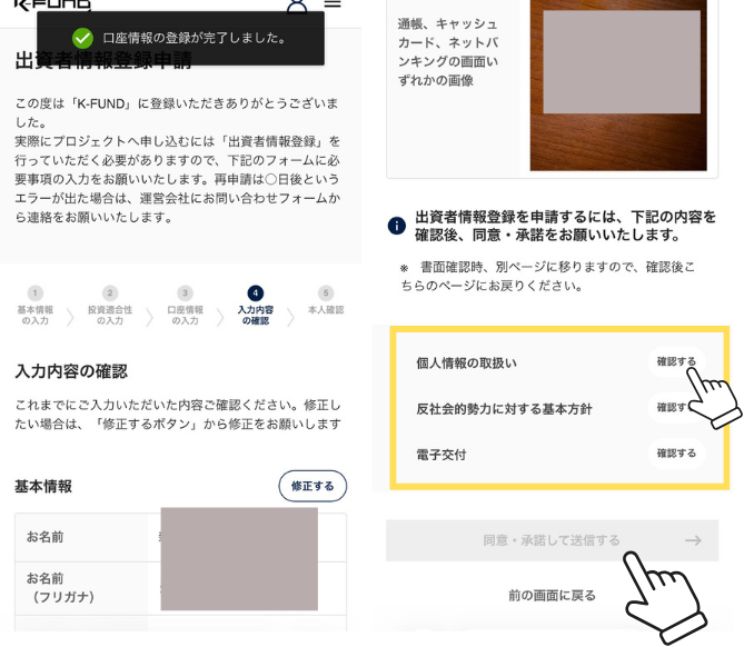個人情報の取り扱い・反社会的勢力に対する基本方針・電子交付、3点すべて「確認する」をタップ→「同意・承諾して送信する」をタップ!