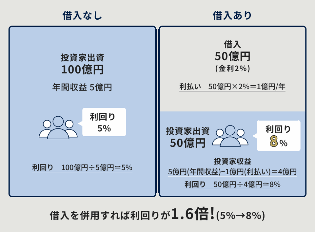投資家さんからの出資だけじゃなくて、銀行の資金も組み合わせることで、より効率よく運用できるようになってるんだよ✨
