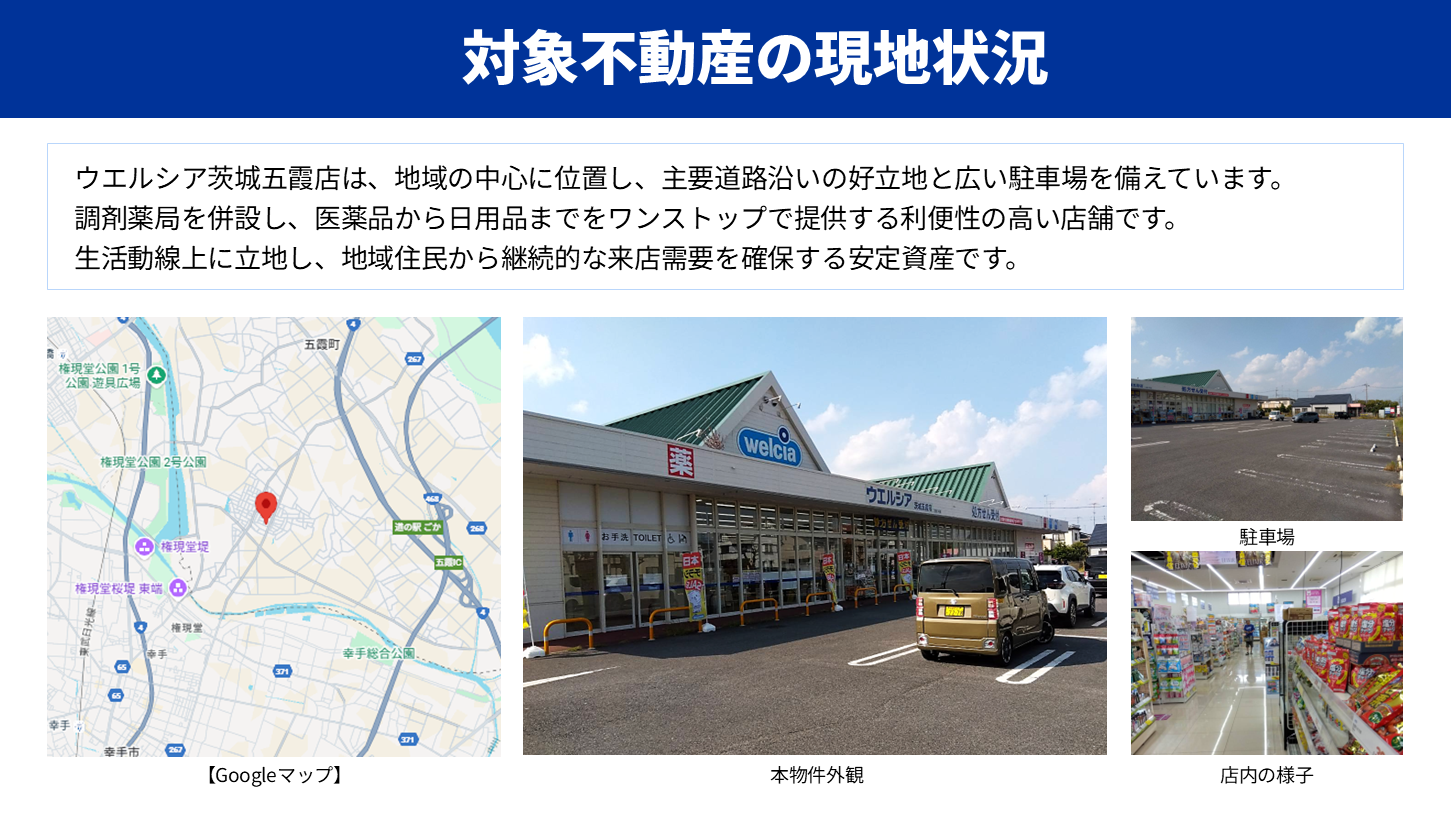 - 医薬・日用品を扱う安定業態で、長期的な資産価値を維持