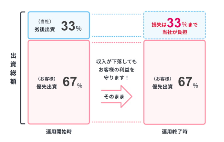 投資家の資金を「優先出資」、事業者の資金を「劣後出資」に分けて運用する仕組みのこと