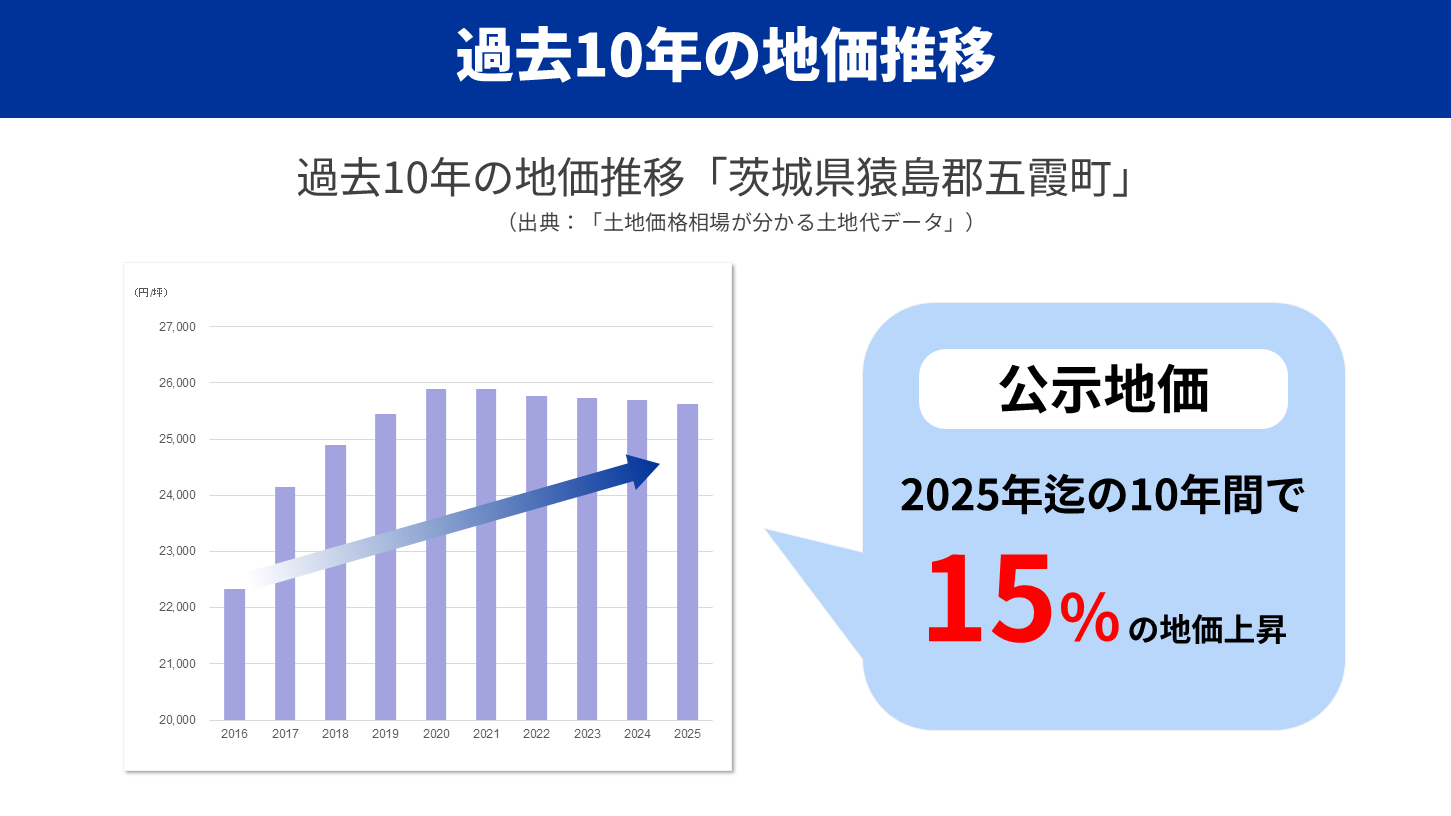 また、「茨城県猿島郡五霞町」は、過去10年間で地価が15%も上昇しているエリアだよ👍