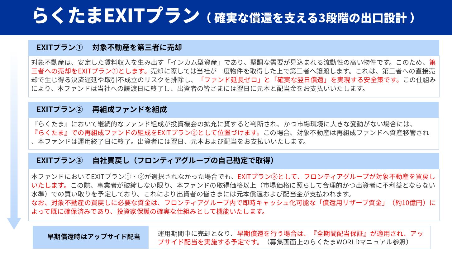 そして3つ目の出口戦略は、もし①と②の出口戦略がうまくいかなかった場合に、運営会社のフロンティアグループがこの物件を買い取るよ✨