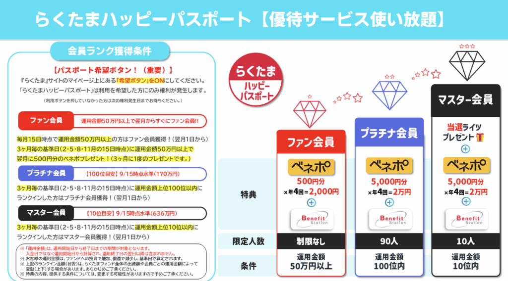 運用期間中の投資額(50万円以上〜)に応じて年に4回投資額に応じたベネポがもらえるの!ベネポはペイペイにも交換可能で使いやすいよ!さらに次回ファンド当選確率UPの権利付与されるよ👍